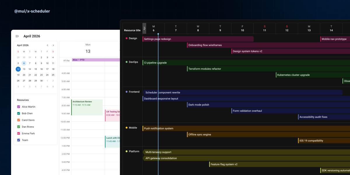 Install the package and render the Scheduler in minutes: start in the MUI X Scheduler docs and follow the quickstart guide for your first working calendar. Then layer your event model and resources on top, and switch to Event Timeline when your use case needs dense resource planning.